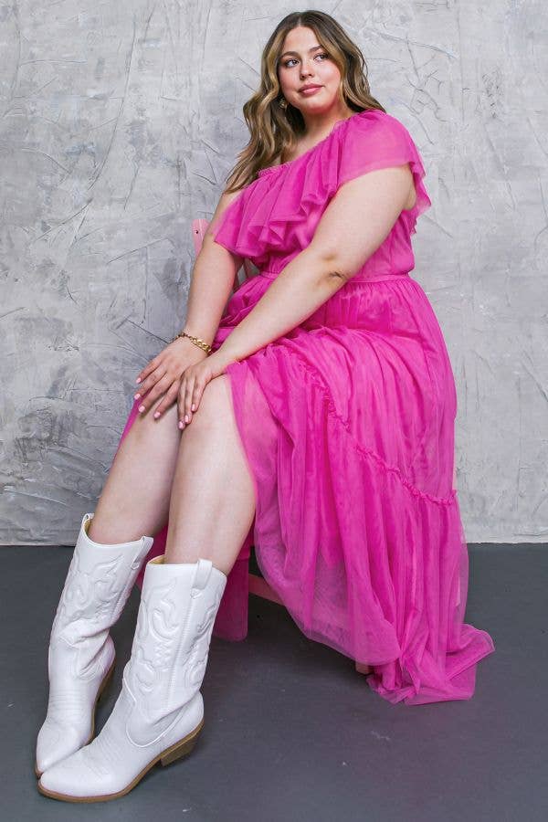 A tulle midi dress featuring one shoulder neckline, flounce and ruffled hemline Be the life of the party with this playful tulle midi dress. Show off your flirty side with its one shoulder neckline, flounce, and ruffled hemline. Bring the fun wherever you go!