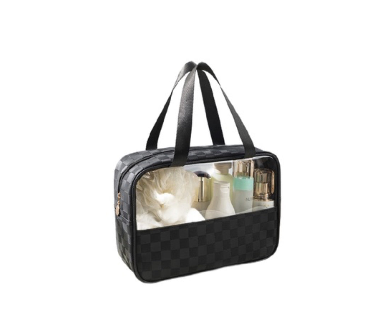 The Ariana Toiletry Bag features a durable zipper with a logo, ensuring long-lasting use and making it a stylish accessory for any traveler's everyday needs.