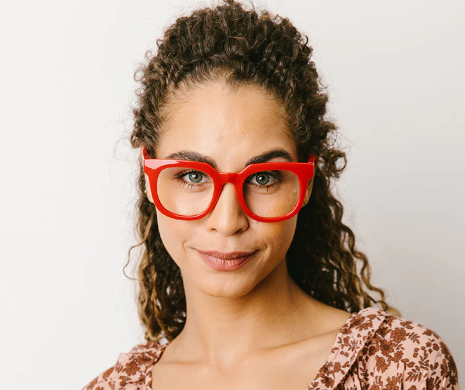 Guaranteed to turn heads and win compliments. Harlow's chunky frame is an oversized soft square that comes in pair-with-anything red,. With gold temple caps to complete this vintage-inspired look, you'll make a chic statement every time.